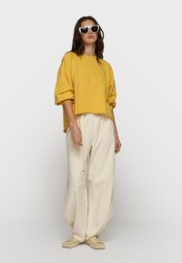 Femme portant de grandes lunettes de soleil blanches, un sweat-shirt jaune ample avec des lettres en relief, et un pantalon crème taille haute, main dans la poche.
