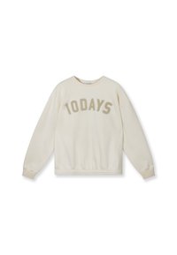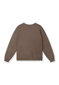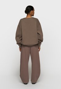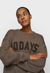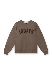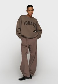 Femme debout, les mains dans les poches, portant un sweat-shirt marron oversize avec le texte « 10DAYS » et un pantalon assorti marron, devant un fond uni.