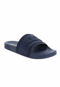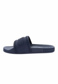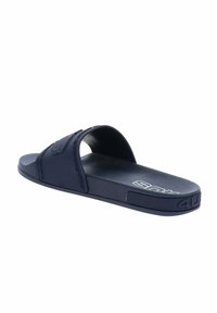 Sandale à enfiler bleu marine avec large sangle ornée d'un logo en relief et semelle intérieure texturée, conçue pour un usage décontracté.