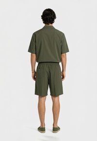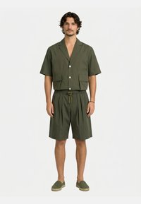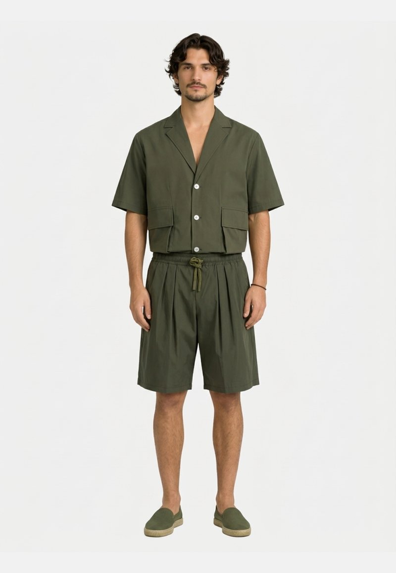 Homme portant une chemise courte à manches courtes vert olive boutonnée avec des poches avant, un short assorti avec cordon de serrage, et des chaussures faciles à enfiler, debout sur fond blanc.