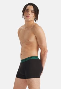 Jeune homme aux taches de rousseur et dreadlocks courtes, debout pieds nus, portant un boxer noir avec une ceinture verte ornée d'un logo trèfle.
