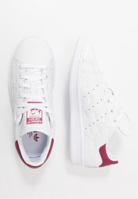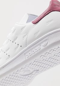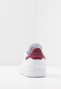 Baskets en cuir blanc avec un talon en marroon, des détails perforés et des accents texturés, dotées d'une semelle en caoutchouc lisse et d'un marquage.