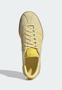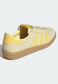 Sneaker en daim beige avec trois rayures jaunes, un bout arrondi et une semelle en caoutchouc brun. Équipé d'une doublure intérieure douce et d'accents jaunes.