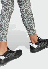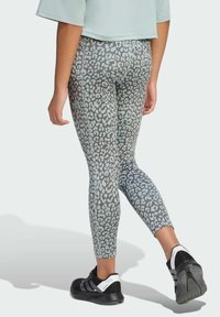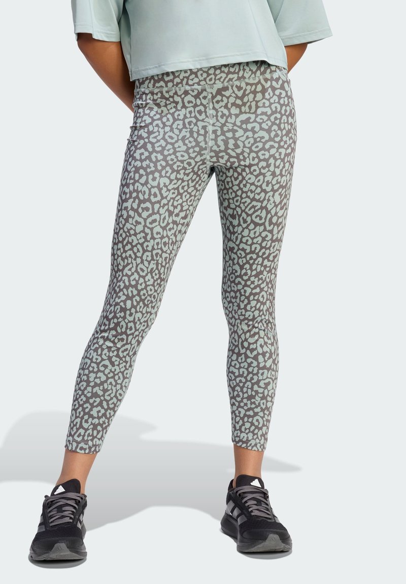 Leggings à imprimé animal avec une base grise et des tâches léopard bleu clair, fabriqués en matière extensible. Associés à des chaussures de sport noires.