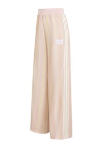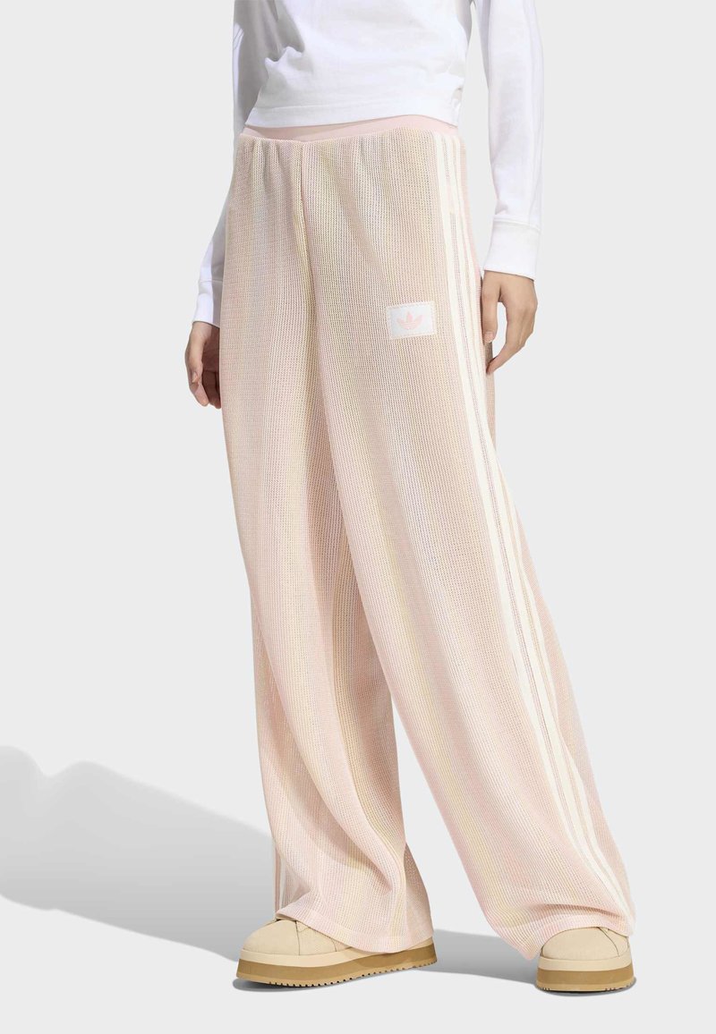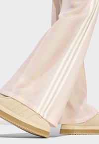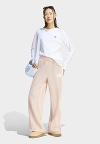 Personne portant un pantalon large texturé rose pâle avec des bandes latérales et un patch logo, associé à des chaussures plates beiges et un haut blanc à manches longues.