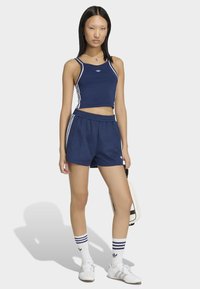 Personne portant un short Adidas bleu marine à rayures blanches, des chaussettes Adidas blanches à rayures bleues et des baskets Adidas blanches.
