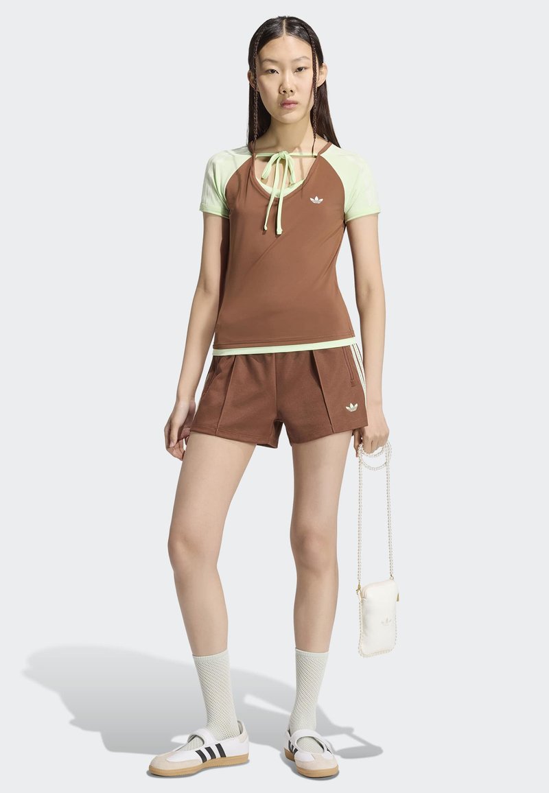 Femme portant un haut de sport marron et vert clair ainsi qu'un short, des chaussettes blanches en mesh, des baskets blanches, tenant un sac blanc avec une chaîne dorée.