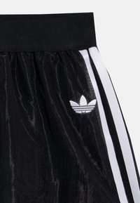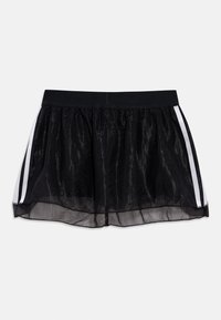 Jupe en mesh noire avec un design froncé, une large ceinture noire et des bandes blanches sur les côtés ornées du logo Adidas sur le côté gauche.