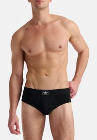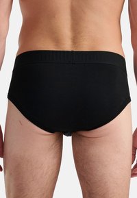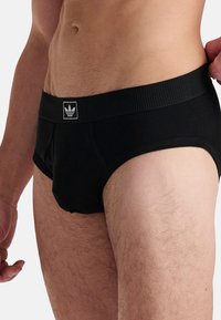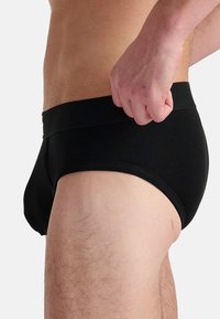 Homme musclé debout pieds nus, portant un slip noir de marque, regardant sur le côté sur un fond blanc uni.