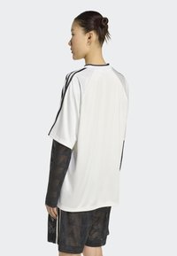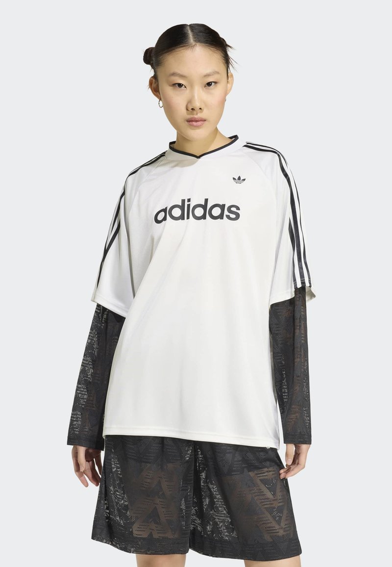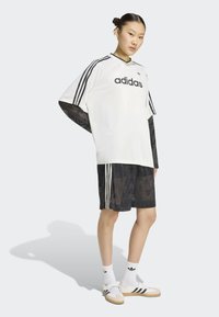 Femme portant un immense t-shirt blanc Adidas avec des bandes noires et un logo, superposé à un haut transparent noir à motifs et un short.
