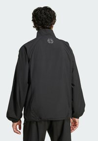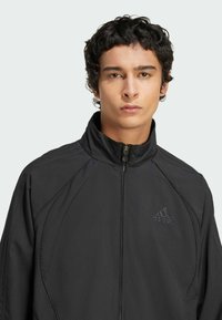 Veste de sport noire avec col montant et fermeture éclair intégrale ; présente des poignets côtelés et des coutures latérales pour une silhouette ajustée. Logo Adidas visible.