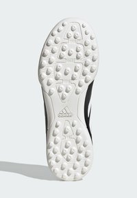 Chaussure de football Adidas noire avec rayures blanches, accents rouges et semelle blanche équipée de petits crampons en caoutchouc pour jeu sur gazon synthétique.