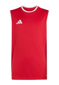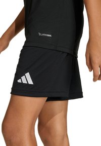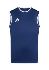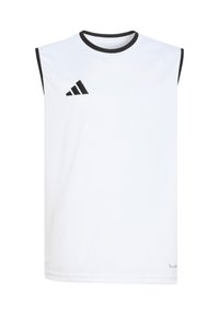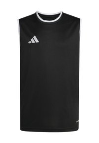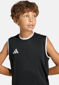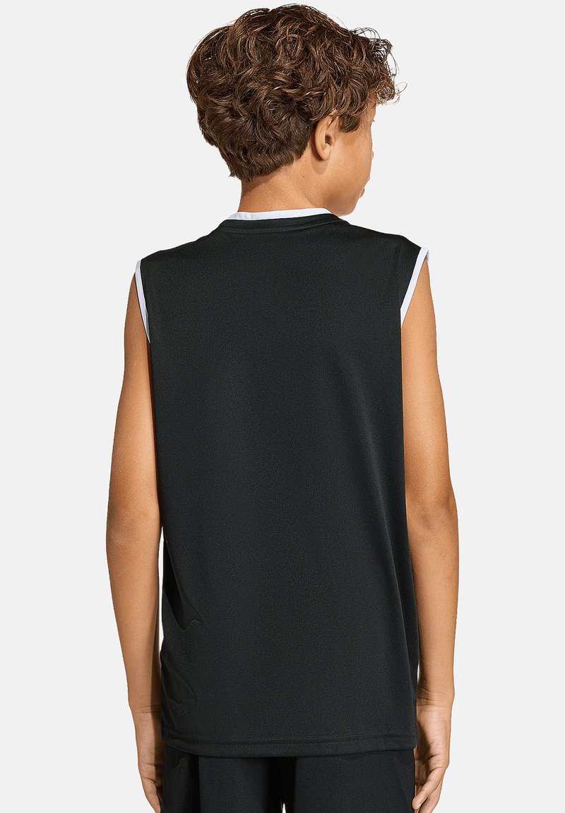Garçon aux cheveux bouclés portant un maillot de sport noir sans manches avec des bordures blanches, debout de dos sur un fond uni.