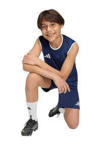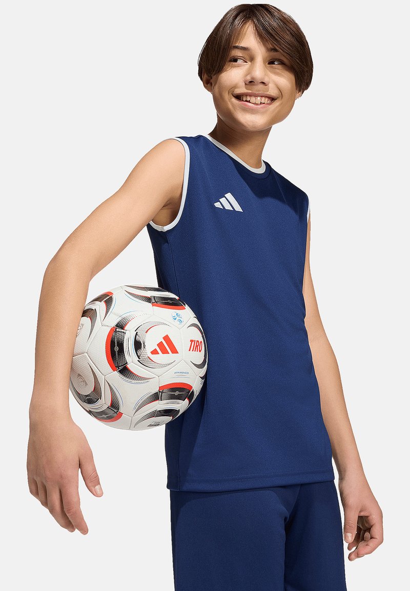 Jeune personne en tenue de sport bleue sans manches tenant un ballon de football Adidas blanc et noir, souriant et regardant sur le côté.