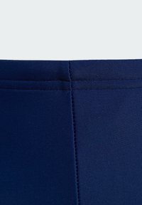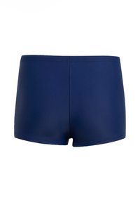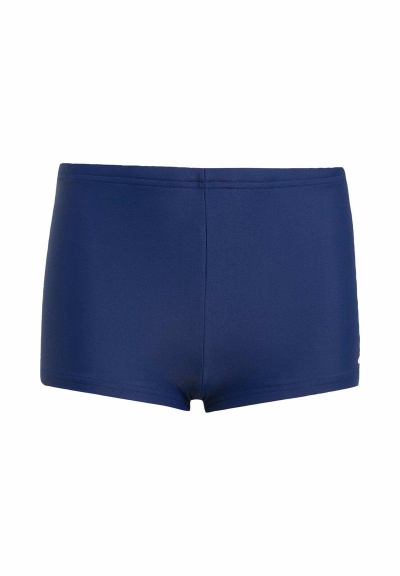 Maillot de bain homme bleu marine avec une coupe ajustée, une coupe rectangulaire et un tissu lisse, présenté sur fond blanc.