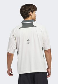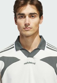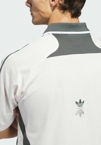 Polo à manches courtes blanc avec des accents gris foncé, doté d'un col contrasté et d'un design graphique dynamique à l'avant. Texture de tissu douce.