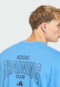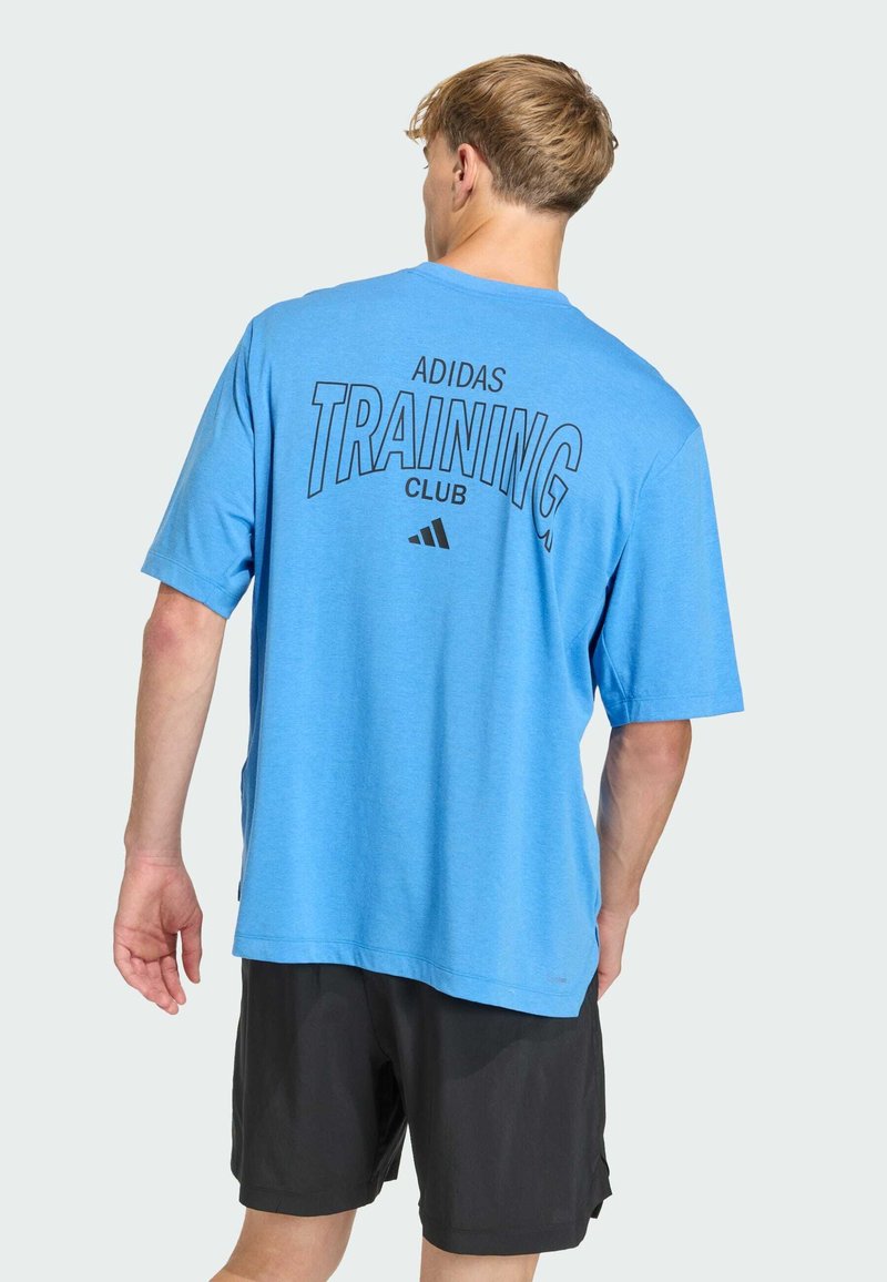 T-shirt bleu à manches courtes avec "ADIDAS TRAINING CLUB" imprimé en noir au dos. Le matériau semble lisse, la coupe est décontractée, assortie à un short noir.