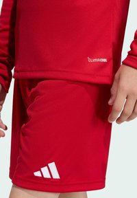 Enfant portant un maillot de sport rouge à manches longues et un short assorti avec des logos Adidas blancs sur un fond uni.