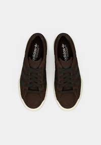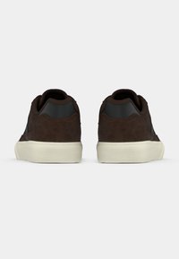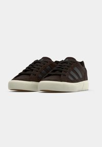 Baskets basses en daim brun foncé avec des rayures noires, des lacets noirs et une semelle en caoutchouc blanc texturé sur fond neutre.