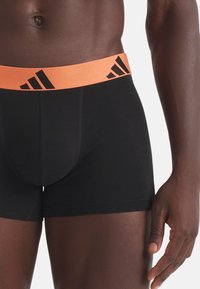 Jeune homme debout pieds nus portant un boxer noir avec une taille orange ornée d'un logo noir, sur un fond clair uni.