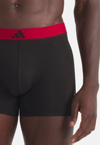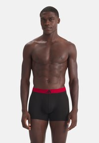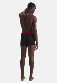 Homme athlétique debout pieds nus, portant un boxer noir avec une ceinture rouge, regardant vers sa gauche sur un fond uni.