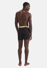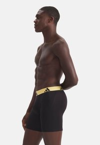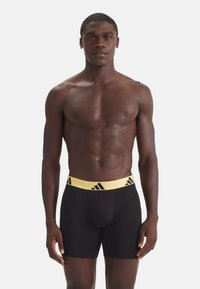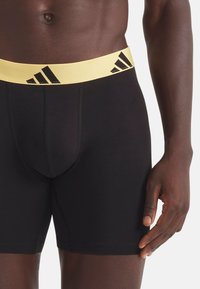 Homme athlétique debout pieds nus sur fond blanc, portant un boxer noir avec une ceinture jaune comportant des logos noirs.