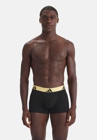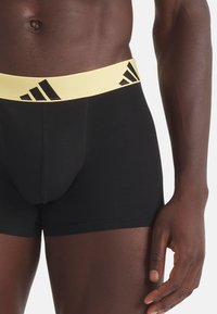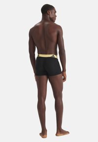Homme musclé debout pieds nus, portant un boxer noir avec une ceinture jaune Adidas, regardant sur le côté, un bras reposant sur l'autre.