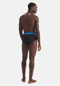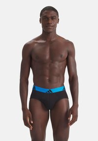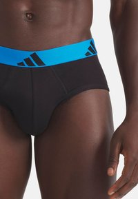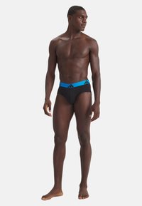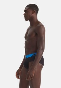 Homme athlétique debout pieds nus, portant un slip noir avec une ceinture bleue arborant un logo Adidas noir, regardant légèrement vers sa gauche.