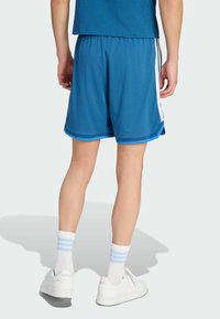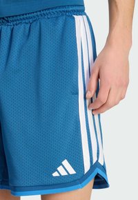 Shorts de sport en mesh bleu avec un design à trois bandes blanches, taille élastique et poches latérales. Portés avec des baskets blanches et des chaussettes rayées.