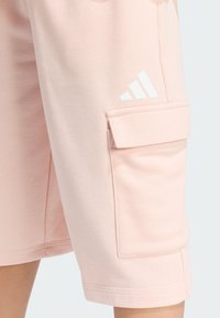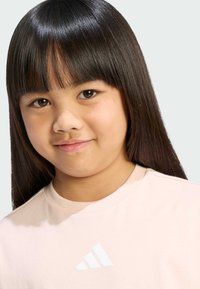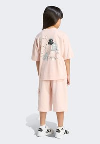 Jeune fille debout, portant un t-shirt oversize rose clair, un short long assorti avec poche, des chaussettes blanches et des baskets blanches à rayures noires.