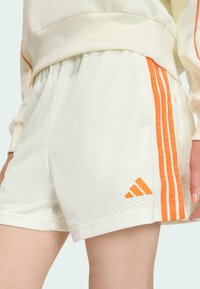 Shorts de sport en mesh blancs avec des accents orange et un logo Adidas, associés à des chaussettes blanches ornées de trois rayures orange et des baskets blanches.
