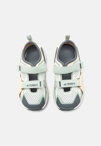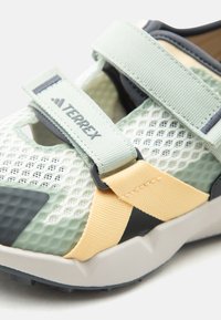 Sandale d'extérieur en mesh vert clair et beige avec brides ajustables, semelle noire et logo Terrex sur le côté.