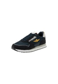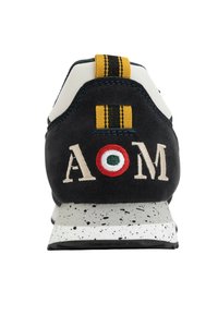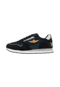 Basket noire et bleu marine avec semelle blanche mouchetée, emblème ailé doré sur le côté et accent talon blanc avec détail logo cousu.