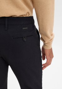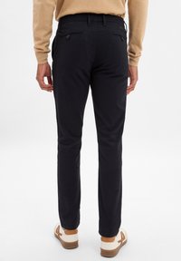 Pantalons slim-fit bleu marine en coton avec une texture lisse, dotés de poches avant et d'une fermeture à bouton, associés à des baskets blanches.
