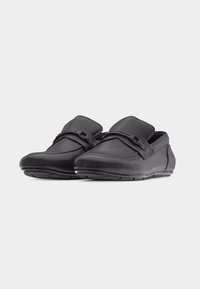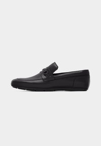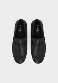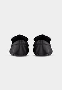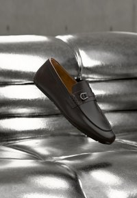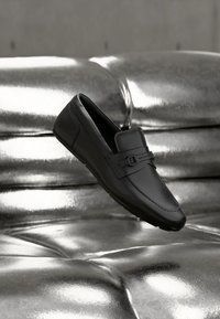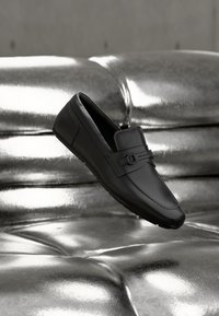 Mocassin en cuir noir avec détail boucle reposant sur une surface argentée métallique et capitonnée réfléchissante.