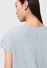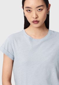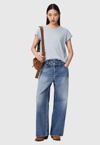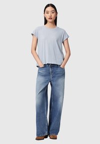 Jeune femme aux cheveux raides et foncés porte un t-shirt bleu clair aux manches retroussées et un jean bleu, debout avec une main dans la poche.