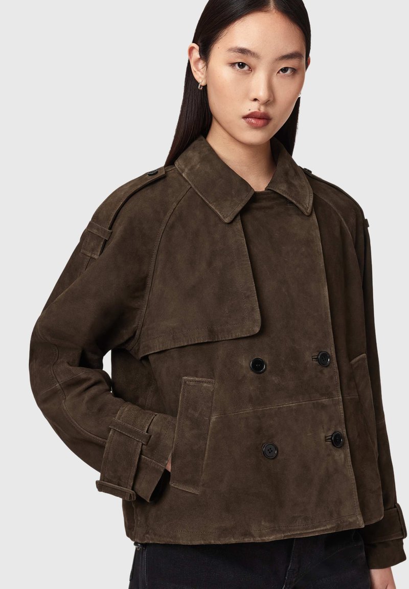 Jeune femme portant une veste croisée en suède brun foncé avec un large col et des détails à sangles sur les manches, sur un fond uni clair.