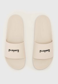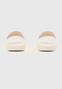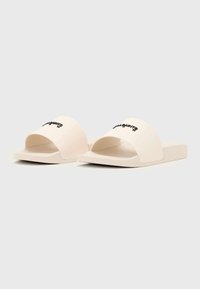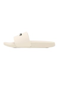 Sandale à semelle beige avec une large bride ornée de texte imprimé noir, semelle plate et bout ouvert, vue de côté sur un fond blanc.