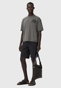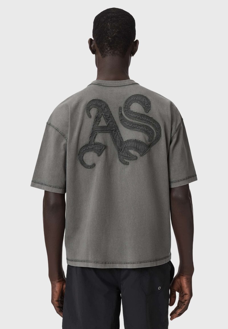 Homme portant un T-shirt gris oversize avec de grandes lettres "AS" texturées au dos, associé à un short noir.