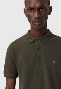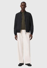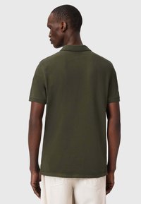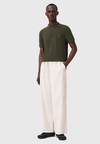 Homme portant un polo à manches courtes vert olive avec trois boutons et un pantalon blanc, debout devant un fond gris clair uni.