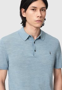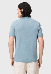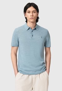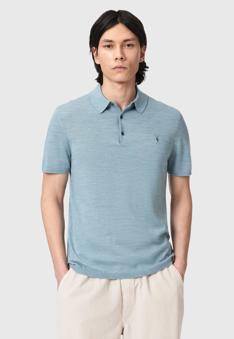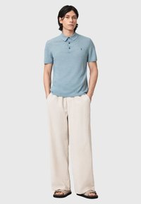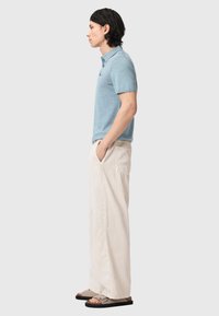 Jeune homme aux cheveux bruns lisses portant un polo à manches courtes bleu clair et un pantalon beige clair, debout les mains dans les poches.