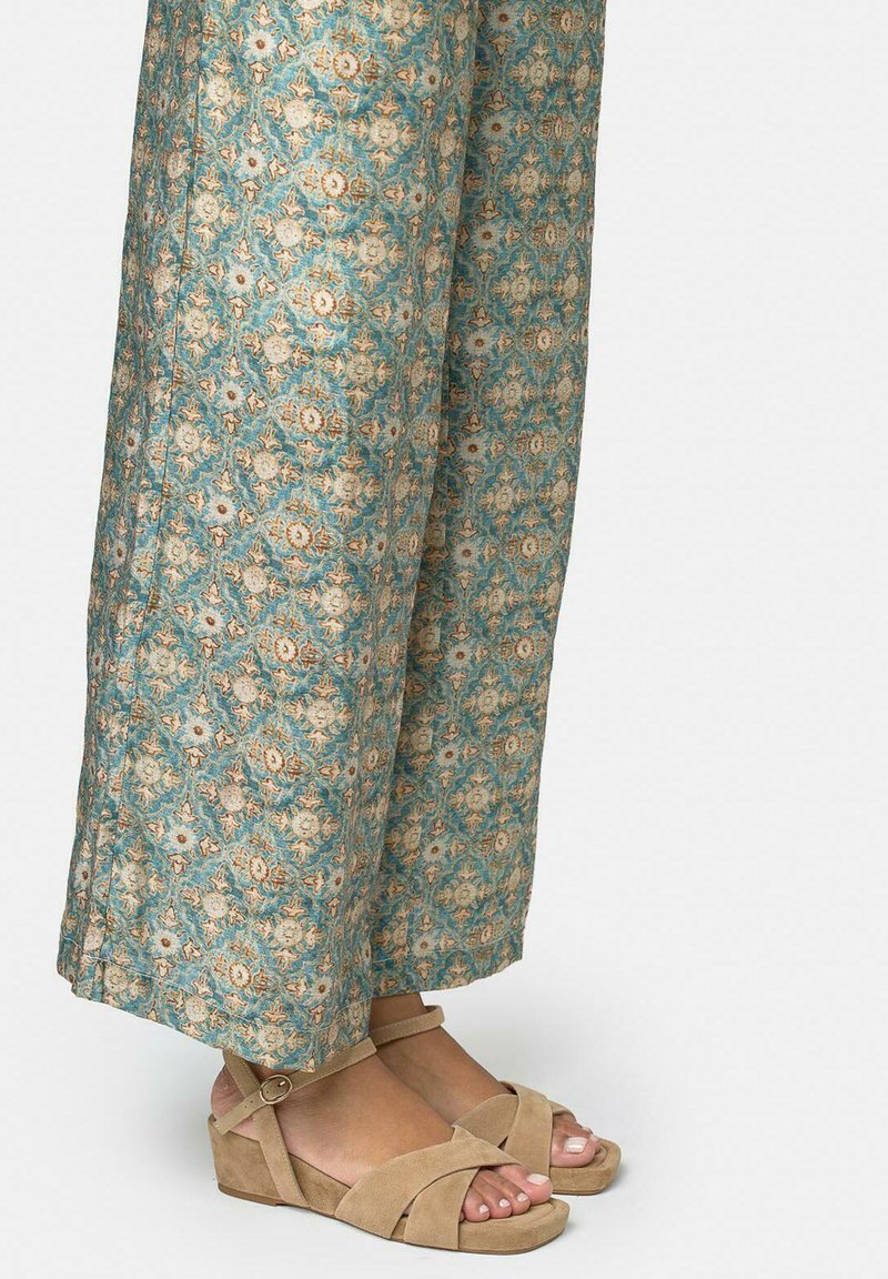 Pieds chaussés de sandales compensées beiges avec des brides à la cheville, portant un pantalon large bleu à motifs floraux.