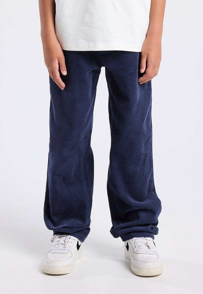 Enfant portant un pantalon large en velours côtelé bleu foncé et des baskets blanches, se tenant devant un fond uni.