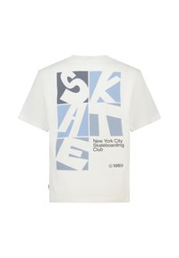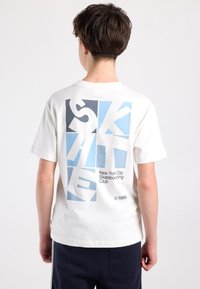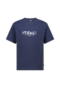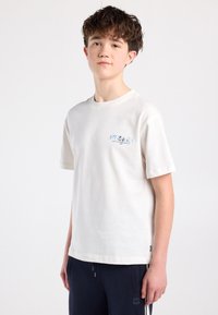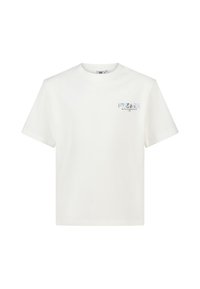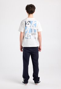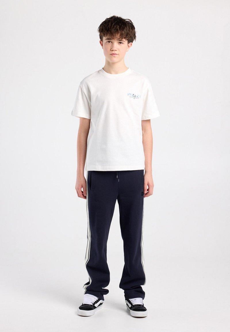 T-shirt en coton blanc à manches courtes avec un petit motif imprimé sur la poitrine gauche, assorti à un pantalon de survêtement bleu marine avec des bandes blanches sur les côtés.