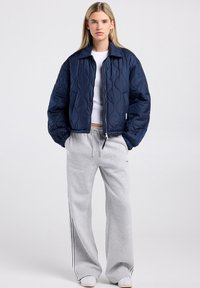 Jeune femme aux cheveux blonds raides portant une veste matelassée bleu marine, un chemisier blanc court et un pantalon de survêtement gris, les mains dans les poches.