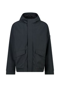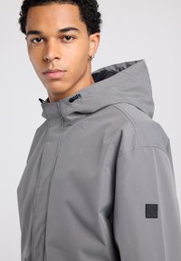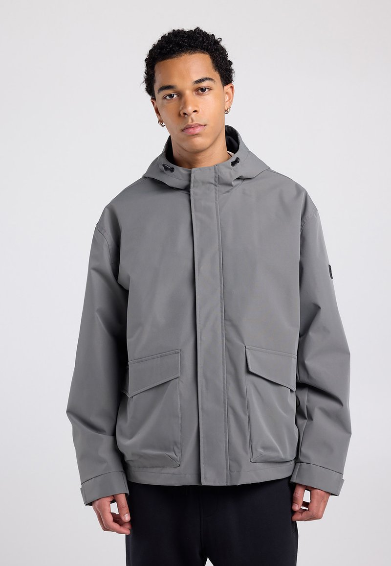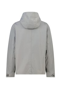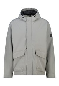 Veste à capuche gris clair avec fermeture éclair frontale, deux grandes poches à rabat et une coupe décontractée. Fabriquée en matériau lisse et résistant à l'eau.