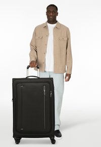 Valise à roulettes noire en tissu lisse, avec une poche zippée à l'avant et une poignée rétractable. Design élégant avec quatre roues pivotantes pour une mobilité aisée.