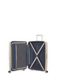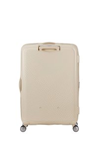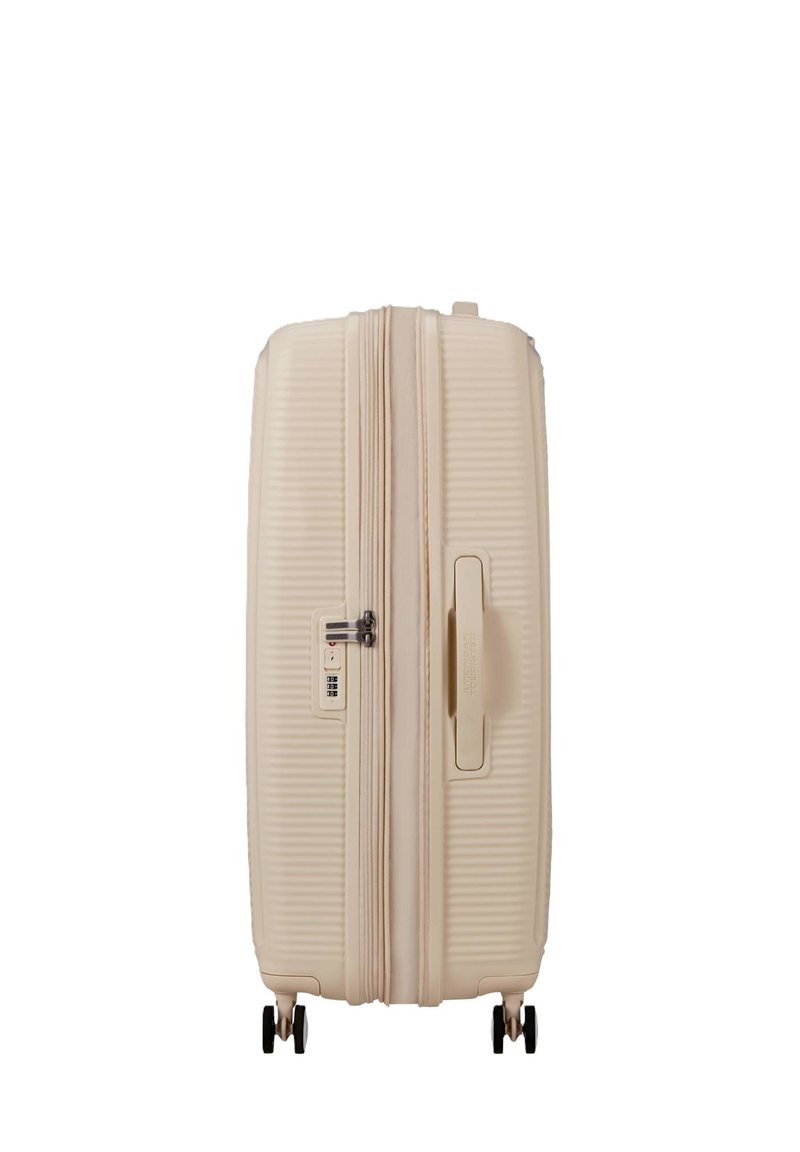 Valise rigide beige avec quatre roues noires, une poignée latérale et une serrure à combinaison intégrée.