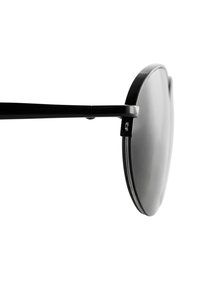 Lunettes de soleil ovales noires avec une fine monture en métal et des verres teintés foncés, présentées sur un fond blanc.