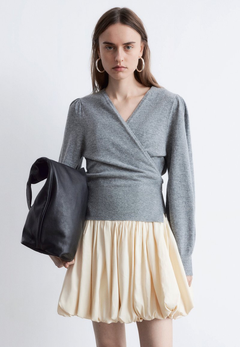 Pull enveloppant gris à manches longues, associé à une jupe boule légère couleur crème. Sac en cuir noir souple avec une anse incurvée.